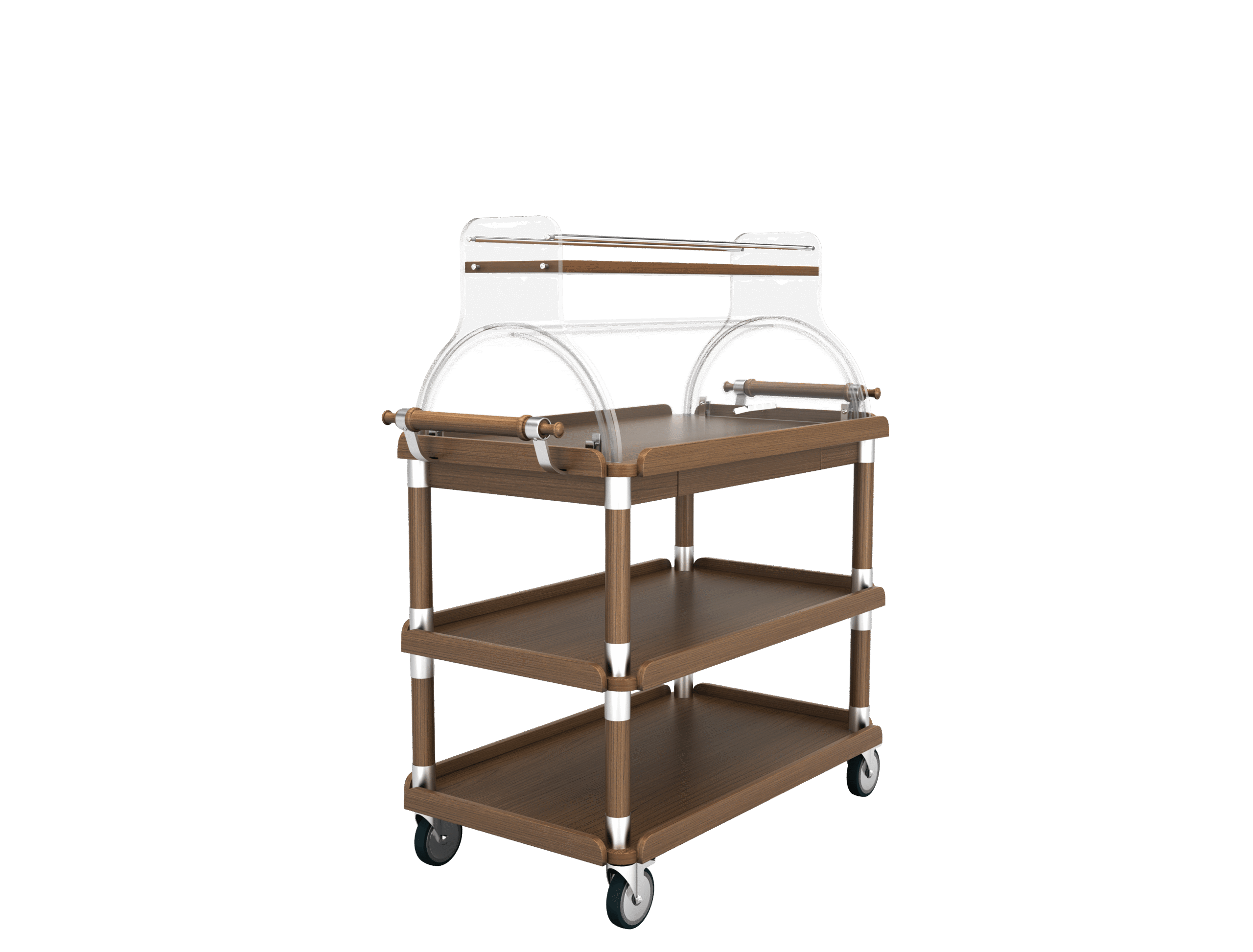 The Otelsan 411 Cheese & Dessert Trolley is a premium presentation trolley designed for high-end hospitality environments such as hotels, restaurants, cafes, patisseries, catering companies, and banquet services. With its elegant wooden body, transparent rolltop cover, and practical service features, it allows cheeses and desserts to be presented both hygienically and visually appealing.